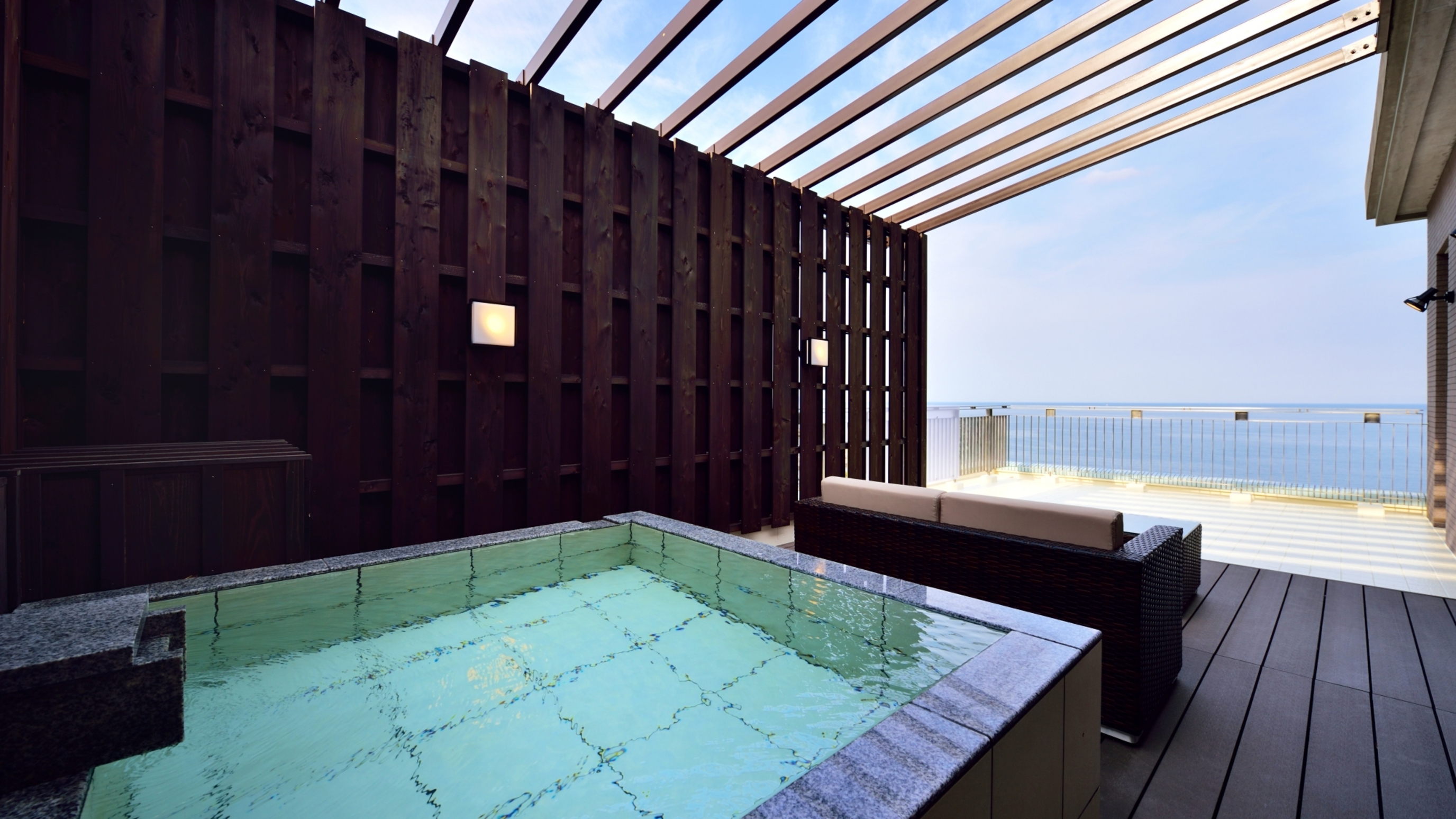 角部屋の広々としたウッドデッキには源泉掛け流しの露天風呂が備わっています。